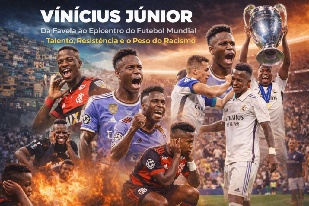 Quando Vinícius Júnior atravessou o gramado do Estádio Santiago Bernabéu numa noite decisiva da Liga dos Campeões, já não era apenas um jovem talento brasileiro em ascensão. Tornara-se símbolo de uma geração que carrega não apenas a responsabilidade de vencer jogos, mas o fardo histórico de confrontar um dos problemas mais persistentes do futebol moderno: o racismo. A sua trajetória, marcada por talento precoce, superação social e resistência pública, é também um retrato das contradições de um esporte que celebra a diversidade, mas ainda convive com os seus próprios fantasmas.